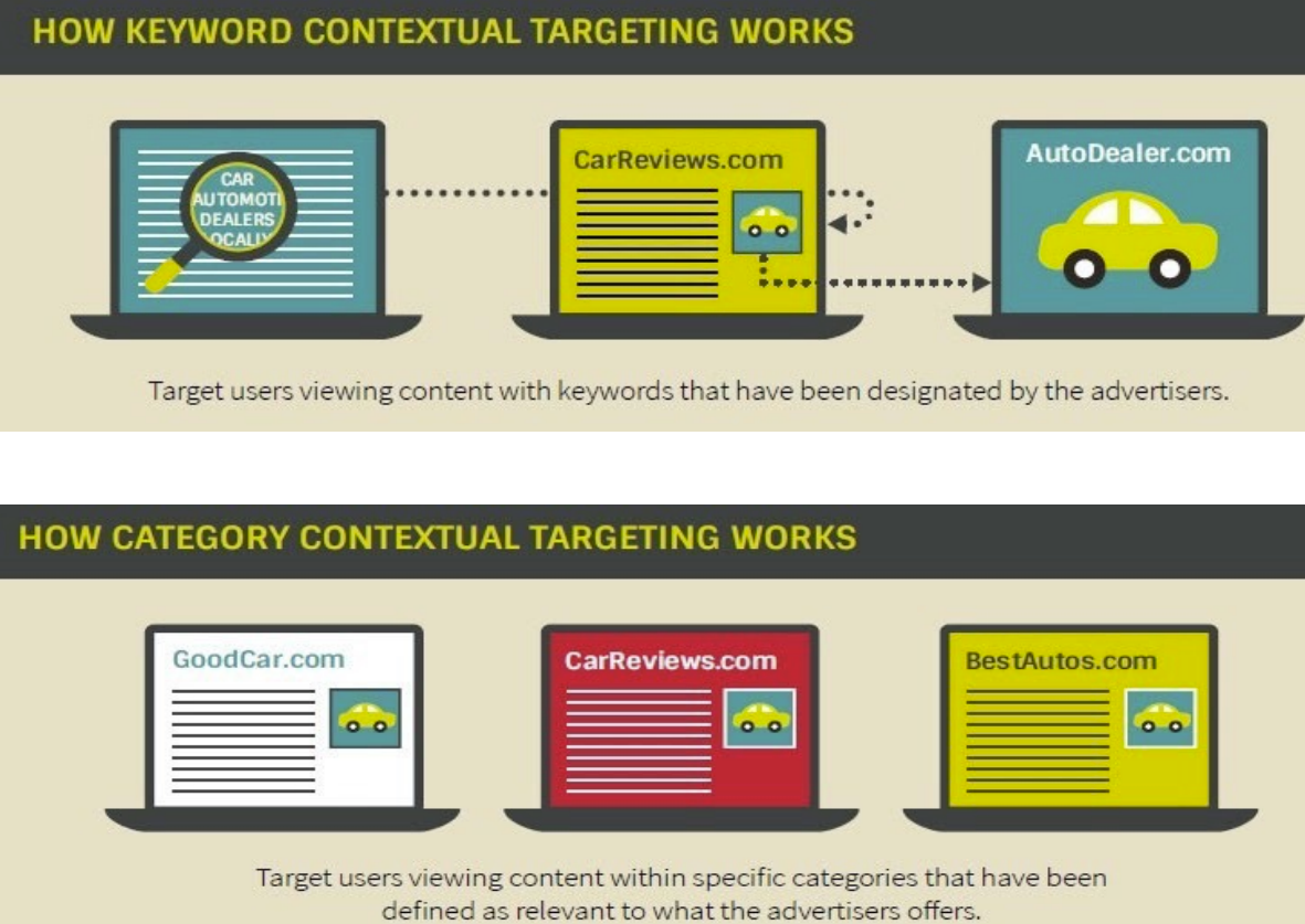 Keyword contextual targeting deliver ads targeted to pages that match specific keywords, whilst category-based contextual ads are targeted to those pages that fall into predetermined categories – preferably based upon the IAB Tech Lab content taxonomy which is constantly being updated.