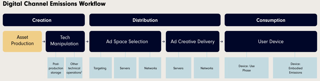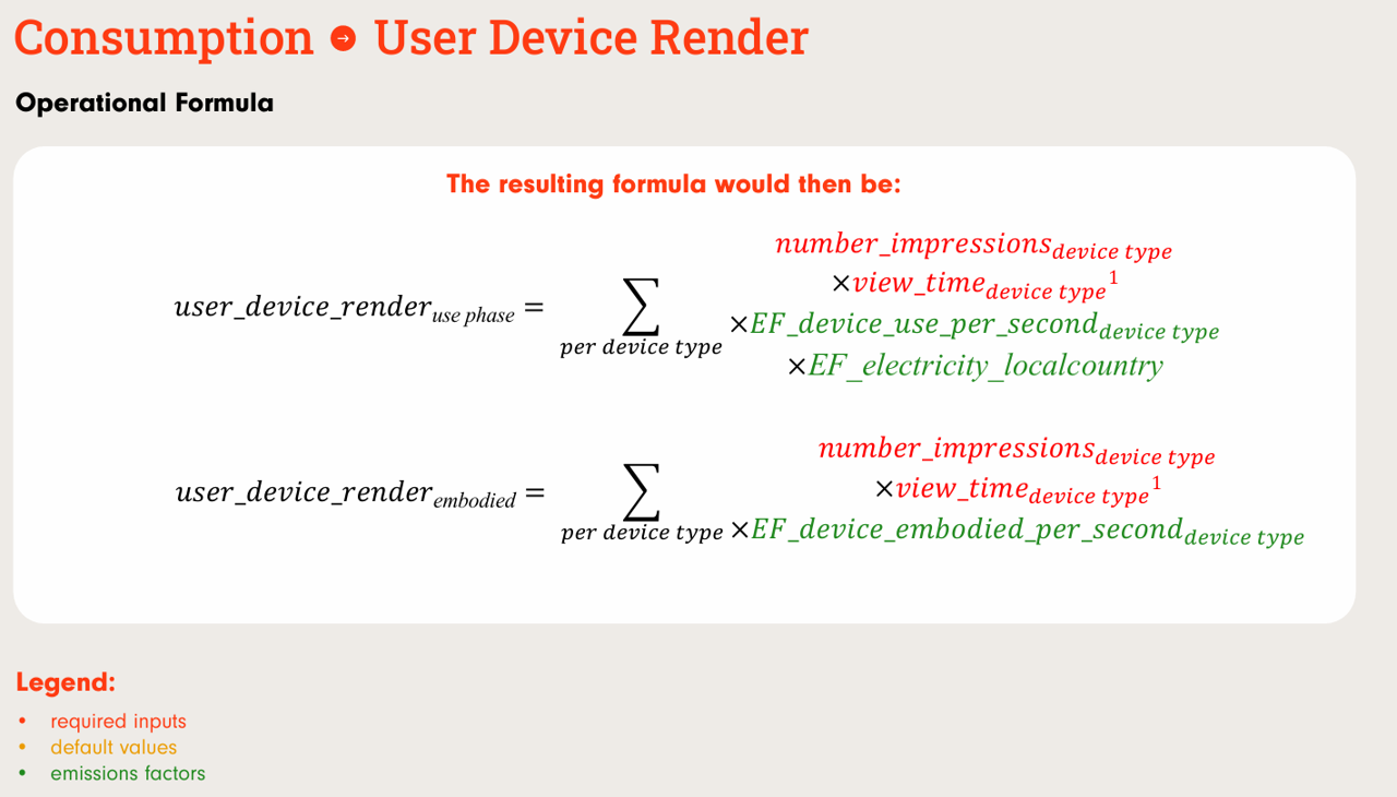Consumption – types of user devices and web applications ultimately loading, streaming and rendering the ad. This is calculated using real-world data such as ad impressions, file sizes, and electricity grid factors to calculate emissions in kg CO2e.