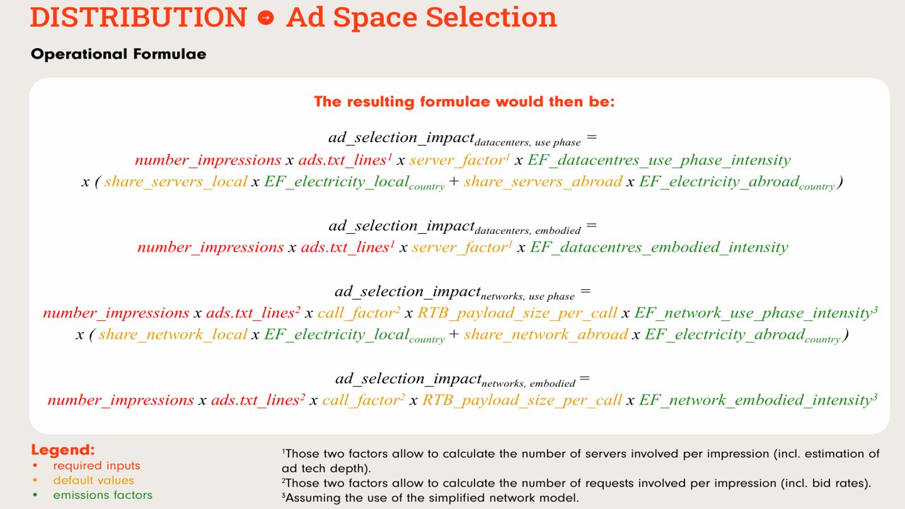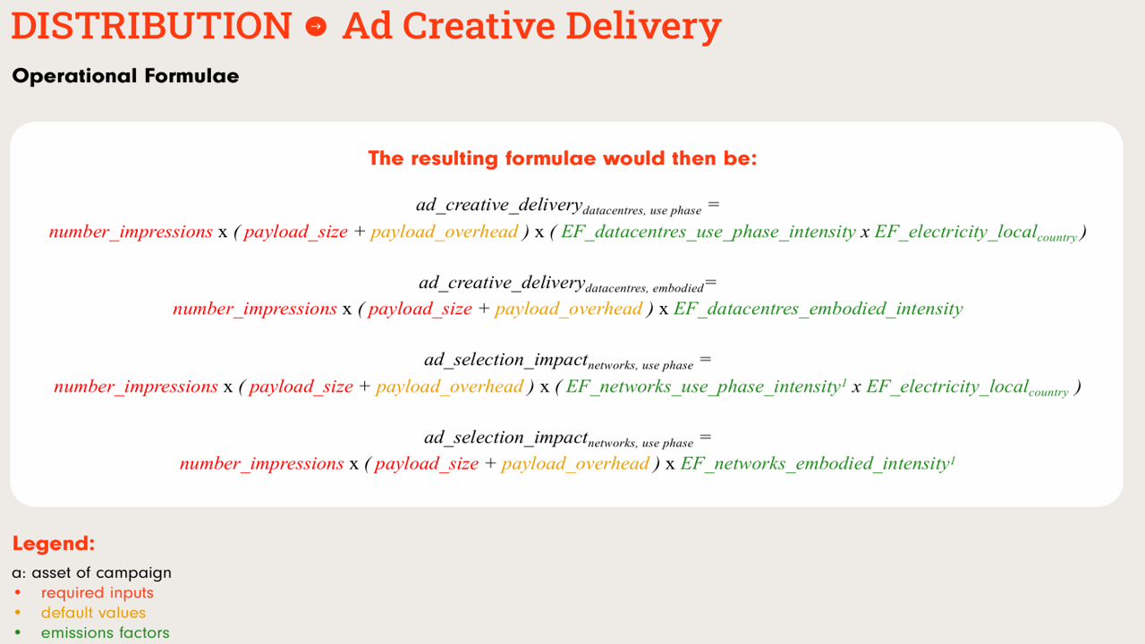 The formulas for Ad Space Selection, Ad Creative Delivery and the User Device can be slightly confronting at a glance. However, within each there are three types of inputs – Required, Default & Emission Factors.