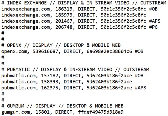 Some ads.txt files are simply a long list of authorised sellers with each seller account ID listed as an individual line or potential ‘path’ for programmatic transactions. For an example of a fairly long list (over 2,000) see www.boredpanda.com/ads.txt