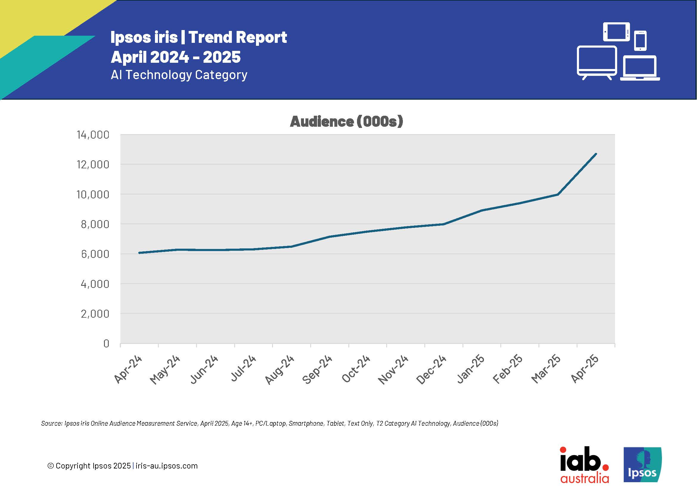 In April 2025 Ipsos iris measured 74 different AI websites and apps; a year ago there were just 29 being measured, demonstrating how the category has grown as more technology is being made available for people to use. The chart below shows how the audience for AI technology has been growing over time.