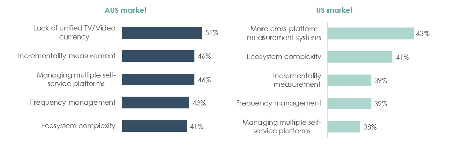 However, when asked about their greatest concerns for the ecosystem, 51% of respondents flagged a lack of unified TV and video currency as their top concern. They also identified ecosystem complexity (41%), challenges in managing frequency (43%) and in managing buys across various self-service platforms (46%) as the greatest threats.
