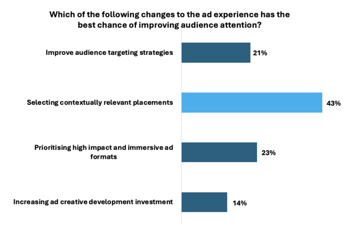 43% of our audience voted that selecting contextually relevant placements was the best way of improving audience attention, while a further 23% voted that prioritising high impact and immersive ad formats was also important in giving the best chance of improving audience attention.