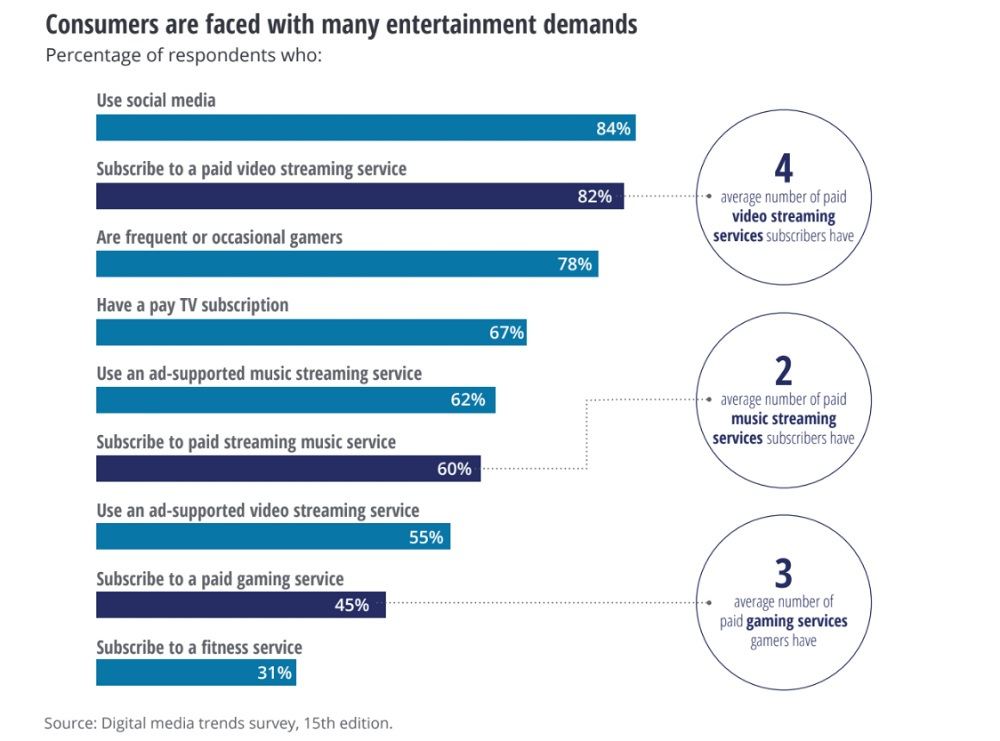 82% of U.S. consumers subscribe to at least one paid streaming video service; and the average subscriber has four paid video streaming services. Some interesting pointers are included regarding how US consumers are increasingly willing to consume ad-supported services as they chase niche content and trending entertainment without being forced to continually pay for additional subscription costs.