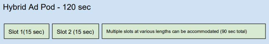 Hybrid Pod: The seller offers a pod structure containing both structured and dynamic components. In other words, the ad pod is composed of some combination of ad slots with predetermined durations, and ad slots constrained by a total duration and also a maximum number of ads.