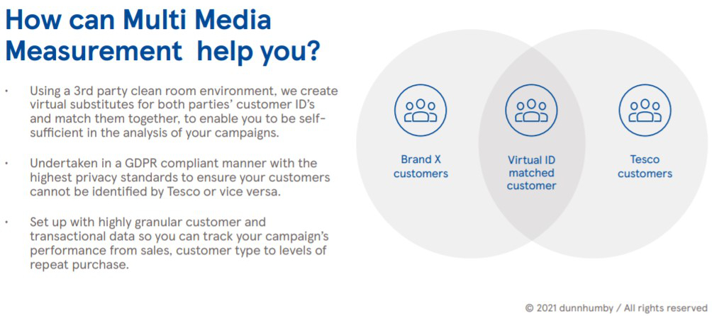 Multi Media Measurement – enabling Tesco’s brand partners to close the media measurement loop by by linking any advertising exposure with Tesco’s purchasing data to measure and evaluate all of their media campaigns, both on and off Tesco’s retail media estate.