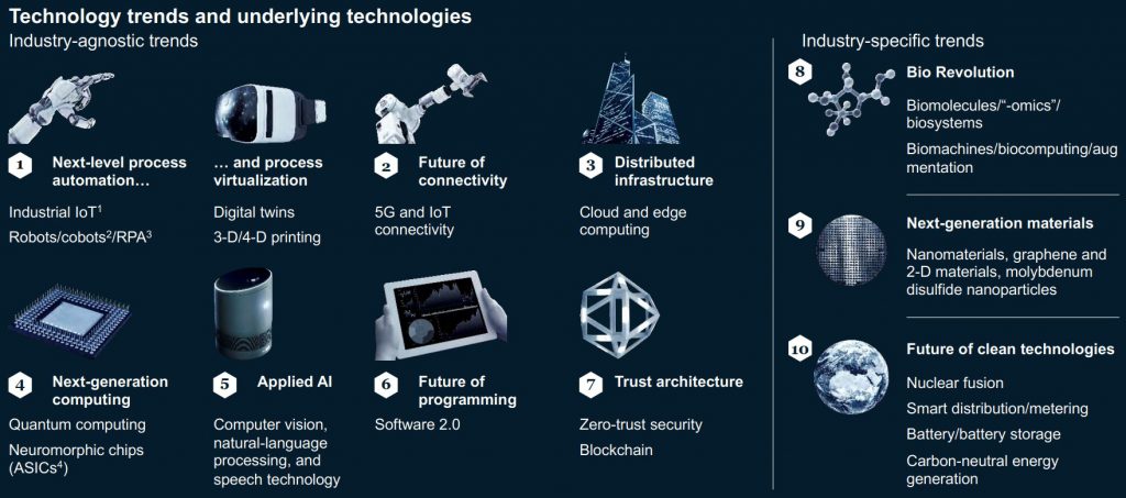 Predictably, machine learning is a prevalent theme across the technology trends – and McKinsey believes this will shape the technology strategy across many industries. Application areas include using technology such as natural language processing, machine vision and speech technology for rapid development cycles, improving custom insights, and reducing repetitive tasks.