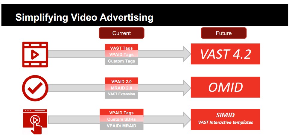 VAST: The Video Ad Serving Template is an XML response framework that enables a consistent delivery format for ad across streaming video and audio platforms. Click here for the VAST specs