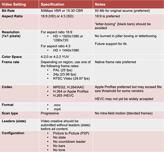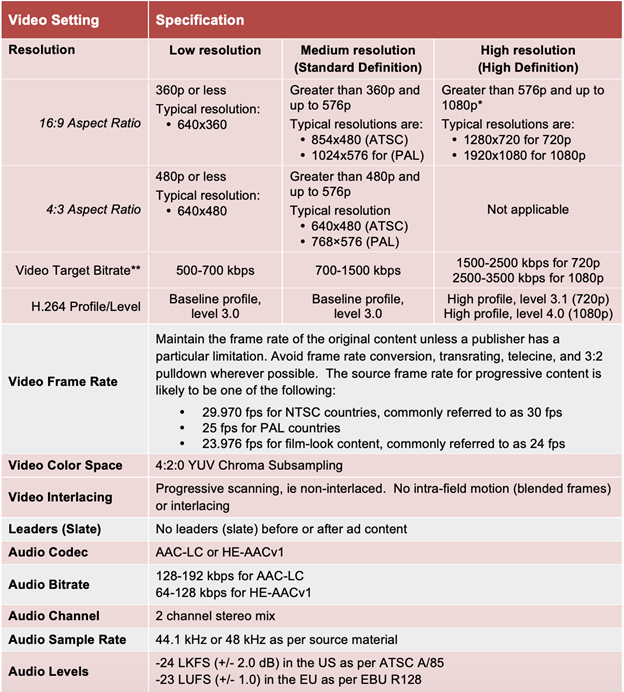 The full specifications and details for each of the four file submission guidelines are outlined in the Digital Video In-Stream Ad Format Guidelines available at the bottom of this page.