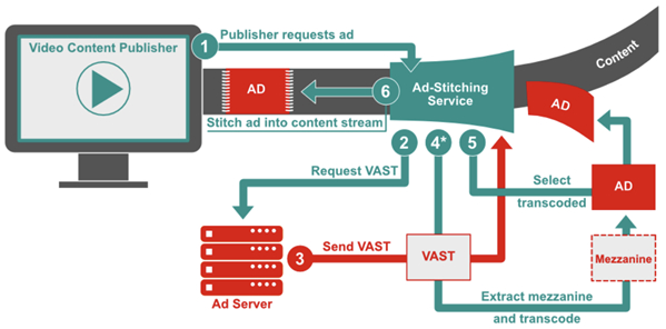 - Request Ads via Ad Call: The ad-stitching service makes a request to the ad server. For VOD, this is typically VMAP or In-line VMAP with VAST to the main ad decision software. For live stream this is a formatted ADS ad call for the single break.