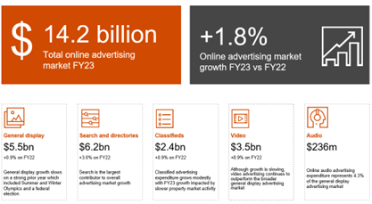 Video advertising, up 8.9% on FY22 ($3.5 billion), continues to outperform the broader general display advertising market with its growth offsetting declines in other formats of general display. The Audio category totalled $236 million and represented 4.3% of the general display advertising market, no comparative trend data is available for audio as reporting started in CY22. Search and directories is the largest contributor to overall advertising growth, up 3% on FY22 ($6.2 billion). Classified advertising investment grew modestly by 0.9% on FY22 ($2.4 billion) impacted by slower property market activity. General display, which includes video, audio and other forms of display advertising, also grew by 0.9% on FY22 ($5.5 billion) on a strong prior year which included the Olympics and Federal Election.