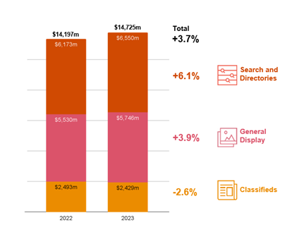General display grew 3.9% ($5.7bn) year on year, search and directories grew 6.1% ($6.6bn), whilst classified listings dropped by 2.6% ($2.4bn) impacted by slower property and job market activity.