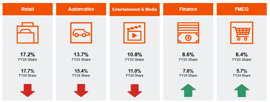- The top five industry categories remain unchanged from June 2024, with retail benefiting from strong end of financial year spend to hold the greatest share, followed by automotive, entertainment & media, finance and health & beauty.