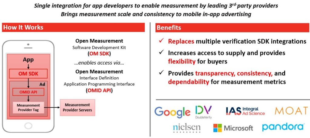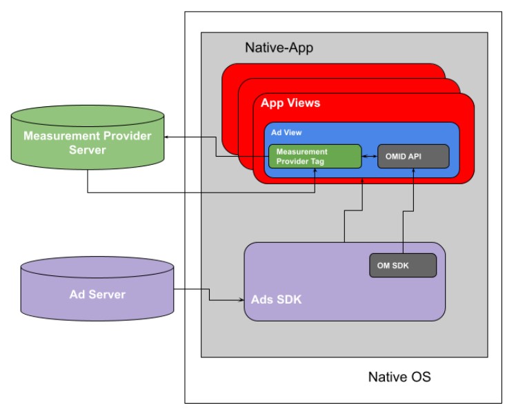 OMID is a dedicated application programming interface (API) that receives all signals collected by sites and apps via the OM SDK. Measurement service providers then place their scripts within the ad creative in order to transmit those signals to their own servers via the OMID. This enables third-party verification providers to effectively measure ads served to any mobile SDK that implements that API.