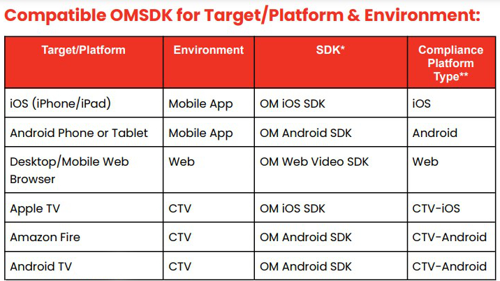 Wider support for Native Apps for CTV – the OM SDK includes both native libraries and JavaScript, which have now been extended to include platform specific libraries for iOS, tvOS,Android or AndroidTV. Implemented natively on the device for collecting and publishing viewability signals that support viewable impressions as defined by MRC.