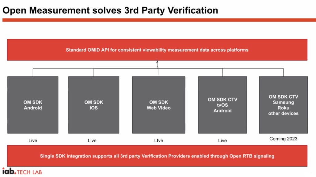 IAB Tech Lab have now extended the capabilities of Open Measurement (and the associated OM SDK) to include CTV by launching for tvOS and AndroidTV, with other CTV platforms also on the roadmap. OM provides advertisers with the flexibility and choice in choosing verification solutions from their preferred providers whilst also making it easier for publishers to integrate via one SDK (software development kit) and thereby enable ad verification with all verification vendors.