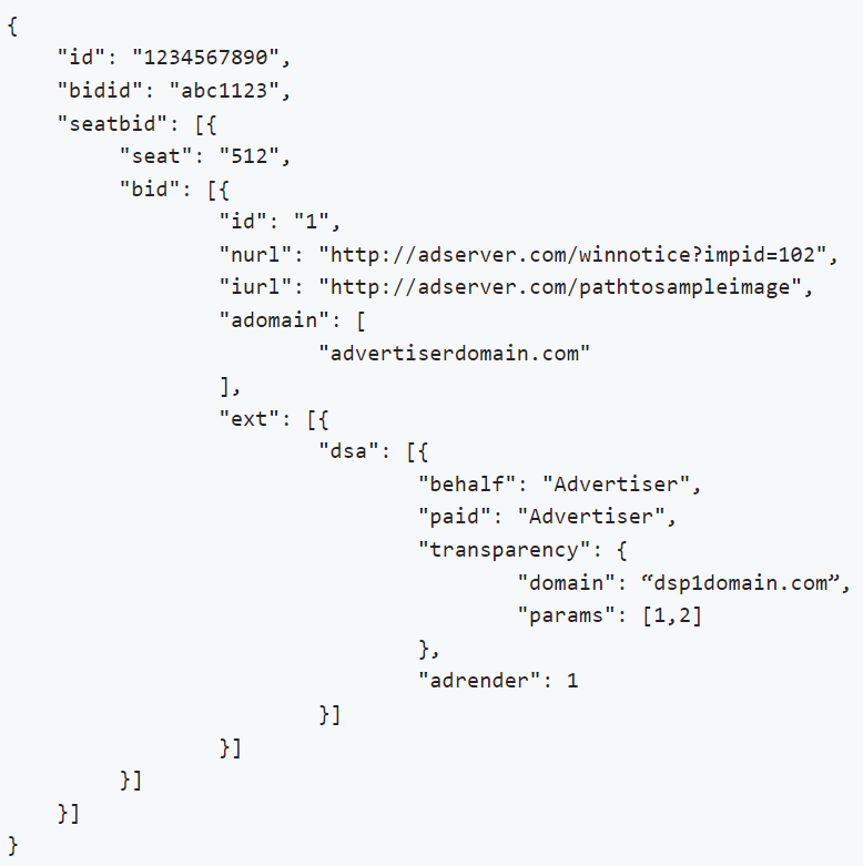 Sample OpenRTB 2.6 Bid Response with DSA transparency: